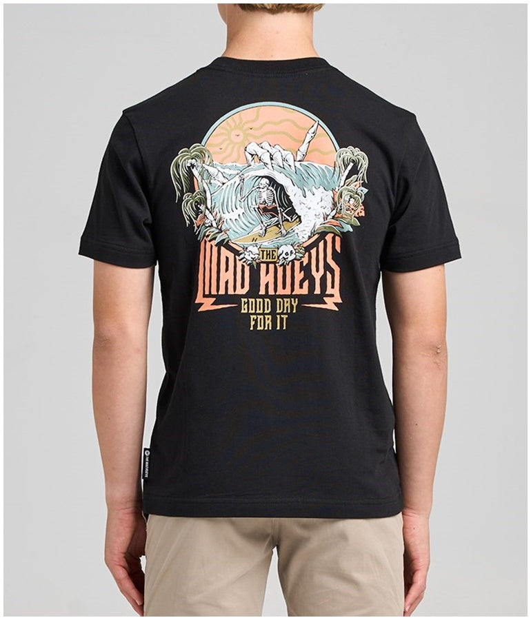 The Youth Boys Tropic Frothin Club SS Tee in Black is for the grom who lives for epic waves and tropical vibes. With a gnarly design featuring palm trees, a massive surf wave, and a skeleton shredding the barrel, this tee is all about that rad surf culture. Perfect for beach days, surf sessions, or just chilling with mates, it’s got the style and attitude to match his adventurous spirit. Throw it on and let him ride the wave of awesome!