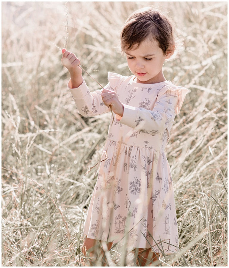 This long sleeve dress will be loved by your little girl, with flutter sleeve detailing and a gorgeous blush colour.  The detailed illustrations were originally hand drawn by Shelley France.